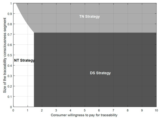 To examine the impact of information disclosure on the sourcing decision of the buyer, we carry out a numerical experiment in a transparent food supply chain with the same parameter initialization as Figure 4. The result is graphically depicted in Figure 6. The size of the optimality regions employing the type supplier (NT strategy and DS strategy) is larger than the regions (NDL strategy and DS strategy) in a nontransparent supply chain (Figure 4). Note that, although the buyer can be more likely to source from a non-traceable supplier in a transparent supply chain, it does not indicate that the buyer would like to source a larger quantity from the type supplier. For instance, while is moderate and is small, the buyer in a transparent supply chain adopts the DS strategy with and , and adopts the NDL strategy in a nontransparent supply chain with and . Although the type supplier is selected in both cases, the sourcing quantity from the type supplier is smaller in the transparent supply chain. Thus, transparency is helpful for improving sustainable traceability, when the non-traceable supplier is engaged in both types of food supply chain. However, the non-traceable supplier is more frequently adopted in the transparent supply chain. This indicates that the effort of information disclosure may fail to improve sustainable traceability.