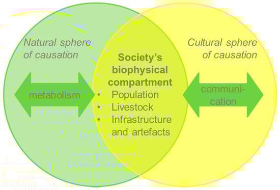 Social ecology in Vienna conceptualizes human societies as “hybrid”, as simultaneously subject to biophysical and socio-cultural spheres of causation [25] (Figure 1). Society has a “biophysical compartment”, containing its human population, livestock, its infrastructure and artefacts, and must entertain biophysical relations with its natural environment in order to maintain and reproduce this compartment. This conceptualization of society is a prerequisite to the systematic study of societies across time and space in terms of their material and energetic inputs and outputs [26], i.e., of their social metabolism, and of their colonizing interventions in the environment. In this context, social metabolism is used to refer to a society’s energetic and material inputs, their transformation, and either integration into societal stocks or output in the shape of exports to other socio-economic systems, or discharge to the environment as wastes and emissions [27]. Colonization describes societal interventions in the environment that aim to render that environment more societally useful than it was prior to the intervention, or than it would be if the intervention were to cease. Deforestation and tilling are examples of colonizing activities that enable the agricultural use of land for society’s biomass metabolism. Social-ecological research is currently advancing to specify the decisive role that society’s biophysical stocks play for resource flows [28], constituting a legacy of past decisions for future development options (Haberl et al., this issue). The material exchange with the environment is not only the result of biophysical needs but is shaped by societal perceptions of nature (and what constitutes a resource), by patterns of consumption, and by socially mediated access to resources. Social metabolism must therefore also be understood as the result of a type of communication within society’s cultural sphere. This communication, in turn, is enabled and shaped by the use of material and energy. The two spheres do not exist independently of one another but are mutually dependent and influential.