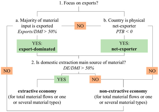 In material terms, we understand extractive economies to be characterized by the domestic extraction of materials for export and propose two data-driven types of operationalization of this understanding. The first allows us to identify economies in which exports biophysically dominate material use by accounting for more than 50% of all material input (from domestic extraction and imports). The second isolates countries that are net-exporters, i.e., they export more than they import. The decision-making flow chart in Figure 1 illustrates how we implemented this understanding with the help of standard indicators of material flow accounting: export per direct material input (DMI = domestic extraction plus imports) or physical trade balance (PTB = imports minus exports, i.e., net imports) and domestic extraction (DE) per DMI. Of course, the two categories potentially overlap: Countries can be export-dominated and net-exporters.