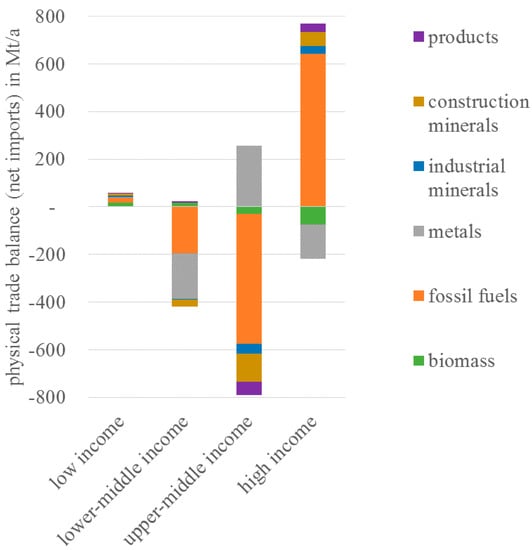 Physical trade balances (imports minus exports) in Megatons per year (Mt/a) by material categories for income-based country groupings [47]. Source of material flow data: [3].