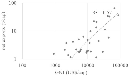 The relationship between exports and GDP is a long-standing topic in development economics, with the identified positive correlation (of the monetary indicators) constituting one of the pillars of export-led development policies [56,57]. As opposed to the analysis based purely on monetary indicators, our results allow us to make two important distinctions: (1) the positive correlation between income and physical exports holds true only for net-exporting countries, i.e., cannot be verified for a general relationship between exports and income; and (2) among the net-exporters, any possible contribution of exports to income also comes at an environmental cost (more material must be exported).