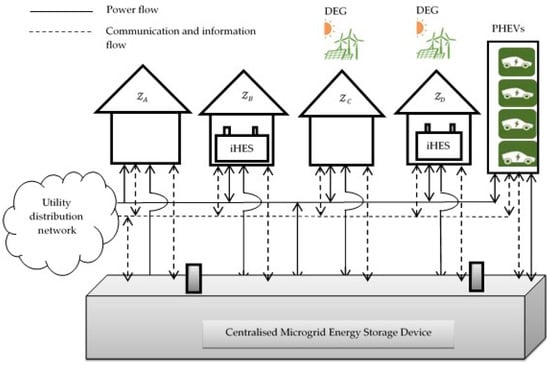 These consumers’ categories are chosen to reflect the possible different types of consumers that can exist in a smart grid or smart microgrid. An active consumer meets its local demand at every time from the energy generated by its local DEG and/or DES, utility grid or MES device depending on energy prices from these sources at the time that the energy is needed. If the active consumer demand is greater than the amount of energy available locally from its DEG and/or DES, then it purchases the difference from the cheaper seller between the grid and MES device. This can, in a way, reduce the need for investment on peaker plants by the utilities. Type-B consumers buy energy for storage and consumption from the cheaper seller between the utility and MES at the optimal buying time, and sells its excess storage (i.e., energy stored beyond daily household consumption) to the highest bidder between utility and MES in order to maximise profit. Similarly, every Type-C consumer optimises its energy consumption, generation, and trading for maximised profit, by selling excess generation to the highest bidder between the utility and MES during the day, and buys from the cheaper seller at night to meet its demand. Also, a Type-D consumer optimises its energy consumption, generation, storage and trading for maximised profit by selling excess generation and/or storage to the highest bidder between the utility and MES and buys from the cheaper seller between the utility and MES, whenever its demand exceeds its local generation (from solar) and storage (iHES) capacities. The PHEVs are also modelled as distributed load, but scheduled in order to avoid over-loading of the grid at any particular time [18,19,20]. The MEM-DOA architecture can also offer better power quality and reliability, while mitigating intermittency of renewable energy resources, e.g., solar, wind.