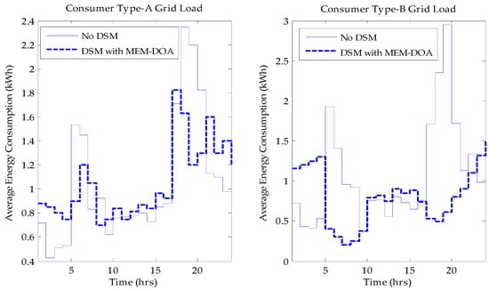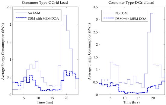The MEM-DOA simulation was considered for four hundred consumers (one hundred households in each category of consumer) with residential data obtained from [27] and Time-of-Use (TOU) pricing tariffs in South Africa adopted [28]. The obtained data was used as the nominal consumption for all consumers. The results of the simulations after rigorous analyses are presented in this section. The demand from the utility grid is presented in Figure 2 (for Type-A and Type-B smart consumers) and Figure 3 (for Type-C and Type-D smart consumers).