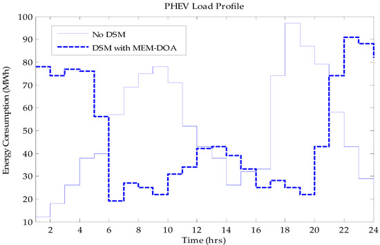 Additionally, the centralised MEM-DOA for the PHEVs ensures that only limited PHEVs are scheduled to be charged from the grid and MES device at peak periods, while most of the PHEV loads are scheduled for charging at night (low price period). The aggregate battery charging/discharging load profile for the hundred PHEVs considered is presented in Figure 4. The load profile showed more consumption at non-peak periods than peak periods as compared to the nominal (No DSM) scenario where individual PHEVs owners could decide to charge their PHEVs in the evenings especially, upon arrival at home. The morning peak observed between 7:00 and 11:00 a.m. was observed to be due to some PHEV owners working in this environment and those coming to charge their batteries at public charging stations located within the microgrid. This MEM-DOA load profile offers the PHEV owners an average of 18% savings on energy expenditure.