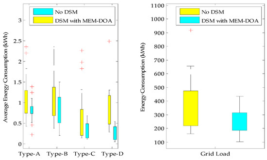 Additionally, box plots per 100 households are presented in Figure 5 for smart residential consumers Types A to D and aggregate energy consumption (including PHEV demand) respectively in the smart microgrid, showing the relationship in the consumption distribution between its average and peak values. The MEM-DOA plots are seen to be better that the initial unscheduled consumption.