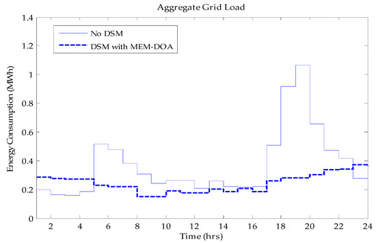 The aggregate grid load is presented in Figure 6 and it can be seen how the MEM-DOA had greatly reduced the peak demand from the grid resulting in a near-table load profile. It can also be noticed that the aggregate peak demand in the MEM-DOA reduced by 68% compared to the traditional peak demand with an aggregate PAR demand reduction by 46% from 2.9 to 1.56. Therefore, instead of the utility acquiring a peaker plant to meet approximately 1.1 MWh, it would only need to purchase one to meet 0.4 MWh demand, which would result in lower tariffs, lower carbon emissions and reduced investment cost in peaker plants. For instance, in South Africa, saving 0.916 kWh of energy reduces CO2 emissions by 1 kg [29,30].