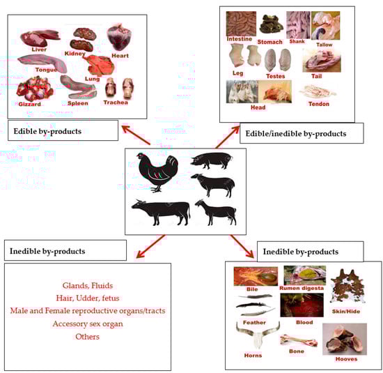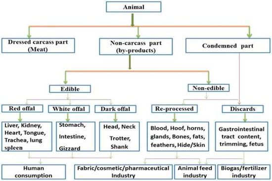 Meat and meat products form an important segment of the human diet because they provide essential nutrients which cannot be easily obtained through vegetables and their derived products [1]. They provide a means for reducing malnutrition and increasing household food and food security [2]. Over the last 20 years, the demand for meat and meat products has increased in many parts of the world (including Africa, Asia, Europe and United States of America) and this has led to rapid surge in livestock production for sustainable food security [3]. The process of converting livestock to meat in abattoirs usually generates a lot of by-products which can be further utilized by humans as food or reprocessed as secondary by-products for both agricultural and industrial uses [4]. The yield of these by-products has been reported to account for about 10% to 15% of the value of the live animal in developed countries, although animal by-products account for about two-third of the animal after slaughter [5]. Basically, animal by-products include all parts of a live animal that are not part of the dressed carcass such as liver, heart, rumen contents, kidney, blood, fats, spleen and meat trimmings. In this sense, the production of these animal by-products can be grouped into non-carcass meat (EBPs) and non-meat products (IEBPs) as shown in Figure 1.