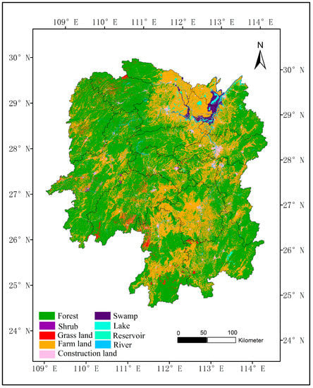 Hunan Province is located in the middle of China, where the middle reaches of the Yangtze River are surrounded by Jiangxi, Chongqing, Guizhou, Guangdong, Guangxi, and Hubei, which includes Changsha, Zhuzhou, Xiangtan, Hengyang, Yueyang, Loudi, Shaoyang, Changde, Yiyang, Chenzhou, Yongzhou, Huaihua, and Xiangxi. With a land area of 211,800 km2, the total population of Hunan Province was 66,290,000 people in 2015. The different types of land and its utilization in Hunan Province in 2015 are shown in Figure 1.