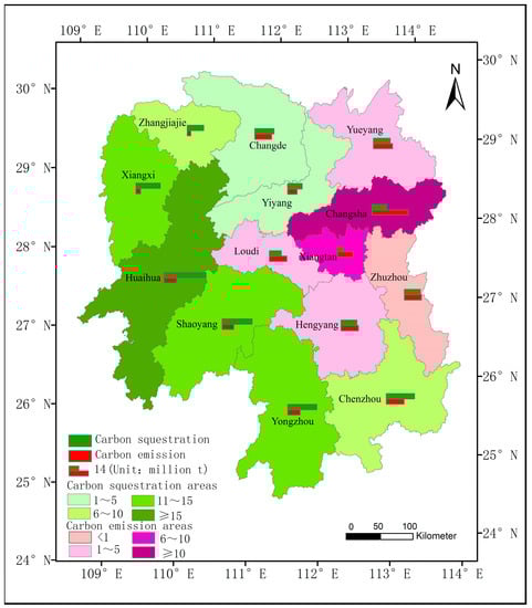 The net carbon emissions of cities in Hunan Province were calculated using Equation (2), revealing that Changsha, Zhuzhou, Xiangtan, Hengyang, Yueyang and Loudi were carbon emission areas, and Shaoyang, Changde, Zhangjiajie, Yiyang, Chenzhou, Yongzhou, Huaihua and Xiangxi were carbon sequestration areas (Figure 2).
