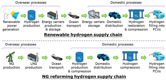 2 or MCH); and the ocean transport of the hydrogen carrier to Japan. The domestic stages comprise: the storage of the hydrogen carrier and its distribution to hydrogen filling stations by tank truck; the release of hydrogen from the energy carrier (restoration) followed by its compression; and finally the filling of FCVs with hydrogen. A reference supply chain of hydrogen produced domestically from the steam reforming of natural gas (NG) was also analyzed. This supply chain comprises: the overseas extraction and liquefaction of NG; the ocean transport of liquefied natural gas (LNG) to Japan; the production of hydrogen by steam reforming of NG which is obtained by LNG regasification; the compression and distribution of hydrogen as compressed gaseous hydrogen (CGH
