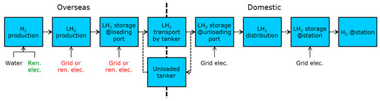 Figure 1 shows the processes that are within the study’s system boundary. The renewable hydrogen supply chain comprises domestic and overseas stages. The overseas stages are: the generation of renewable power; the production of renewable hydrogen by water electrolysis; the production and storage of the hydrogen carrier (LH