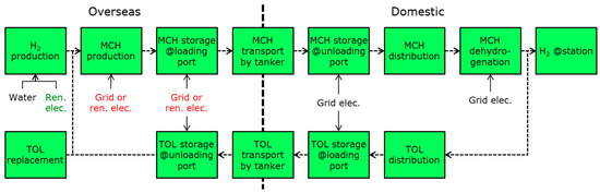 82]. After hydrogenation of TOL at the hydrogen supply site, MCH is transported by tanker and dehydrogenated at the demand site to yield H