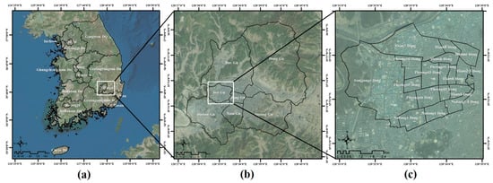 Study areas and assessment levels: (a) Korea; (b) Daegu Metropolitan City; (c) Seo-Gu, Daegu Metropolitan City.