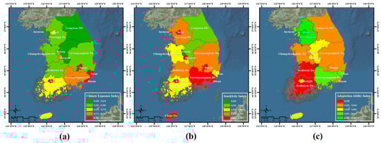Climate exposure, sensitivity, and adaptive capacity indices of Korea in the 2040s: (a) climate exposure; (b) sensitivity; and (c) adaptive capacity.