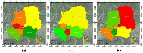 Climate exposure, sensitivity, and adaptive capacity of Daegu Metropolitan City in the 2040s: (a) climate exposure; (b) sensitivity; and (c) adaptive capacity.
