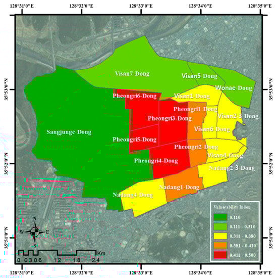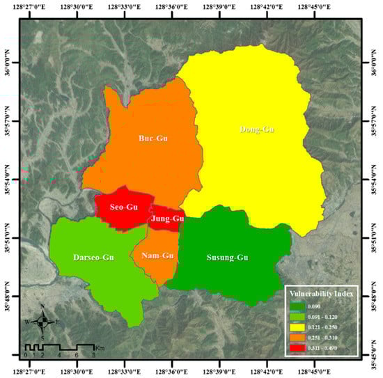 Figure 5 and Table 5 show the results of health vulnerability assessments of the municipalities within Daegu Metropolitan City to heat wave. The most vulnerable municipality to heat wave was Seo-Gu, followed by Jung-Gu, Buk-Gu, and Nam-Gu. This result is attributable to their relatively higher climate exposure and sensitivity indices and the lower adaptive capacity index values of these areas compared with other municipalities.
