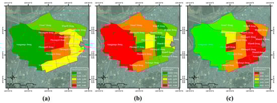 Climate exposure, sensitivity, and adaptive capacity maps of Seo-Gu, Daegu Metropolitan City in the 2040s: (a) climate exposure; (b) sensitivity; and (c) adaptive capacity.