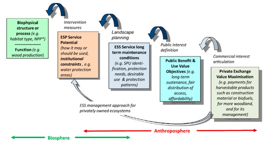 Another point is related to the first challenge, that service provision needs ongoing societal interventions in form of money, labour, and technology. To further elaborate on this intervention, the authors of [21] modified the Cascade Model further and introduced the concept of Ecosystem Service Potentials (ESP). The authors also merged the ecosystem structures and components, and the ecosystem functions into one category of ecosystem properties, representing the biophysical basis of service provision (see Figure 2). They argue that neither are the potentials determined by the functions, nor can they be assessed by analysing the services only: ESP are generated in complex social processes (e.g., increased commodification of nature or struggles about local commons), and these processes determine the kinds of services ultimately realised, or not (e.g., the loss of regulating services). Describing the process in a stepwise manner, first, an ESP must be recognised and the services the system could potentially provide must be identified (the authors call this ‘use-value attribution’). The mobilised ESP can then be either directly consumed, or marketed as commodities. Thus, the benefits provided are either non-monetary benefits or monetary ones [22].