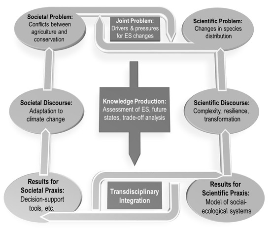 There are various frameworks for conducting transdisciplinary research. Here, we focus on the conceptual, ideal-typical model of transdisciplinarity proposed by the authors of [61]. This model’s basic assumption is that “developing solutions for societal problems always means and requires linking these problems to gaps in the existing bodies of knowledge, that is, to scientific problems. Seemingly self-evident, this proposition, however, allows us to conceptualize the contributions to societal and scientific progress as the two epistemic ends of a single research dynamic.” [61] (p. 4). This general argument is applicable to and highly relevant for ES research. As described above, the ES concept and its scientific pillars are contested–at least when it comes to conflicting worldviews and systems of values within. Additionally, the basis for science-driven assessments is not always perceived to be sufficient. Recent efforts such as IPBES, the TEEB-studies at different scales, or European knowledge brokers such as biodiversity knowledge (KNEU) or EKLIPSE—The European Mechanism for Supporting Better Decision Making on Biodiversity and Ecosystem Services, indicate a need for system knowledge in the field of biodiversity and ecosystem services. They should support a better understanding of processes and the interlinkages between ecosystems and society for the ‘production’ and ‘consumption’ of ES. Some years ago, the debate on the so-called ‘post 2015-targets’ for biodiversity showed that there is also a need for knowledge that supports defining objectives for conservation and sustainable management of ES [64]. In such a situation, the ways and means of reaching those objectives may be highly controversial. In the end, the call for a sound consideration of trade-offs within different policy strategies, or between various actions, suggests that transformation knowledge is needed [65].