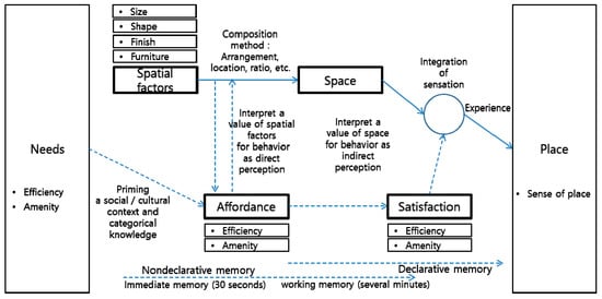 Accordingly, top-down perception and bottom-up perception are integrated with intentionality aimed at amenity and efficiency in association with time-sequential causality [24]. Concepts of affordance and satisfaction are used to describe the structure of the causal relationship between the space design factors and space in occupants’ perceptions [25,26,27,28].