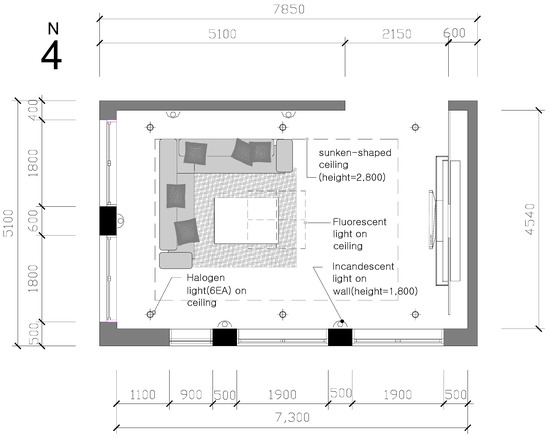 To determine appropriate spatial conditions and dimensions of space for the experiments in this study, the results of a previous study were examined. It was reported that a rectangular shaped space was selected as the most favorable for living rooms in terms of overall satisfaction regarding amenity and efficiency [4]. Specifically, a space 7.33 m wide, 4.55 m deep, and 2.6 m high was preferred by occupants in terms of overall satisfaction with amenity.