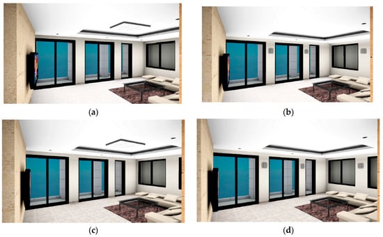 The color of the east and north walls, which were finished with wood, was light brown. The color of the ceiling, which was also finished with wood, was a light gray. These combinations were equally applied to all eight alternatives. The south and west walls, which were finished with paper, were light ivory for cases 1–4 and dark ivory for cases 5–8. The color of the floor, which was covered with marble, was light ivory. As shown in Table 1 and Table 2, different brightness levels were applied to the floor and south and west walls to generate the eight alternatives in this study.