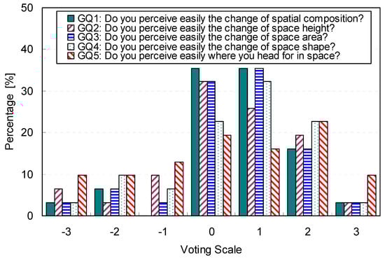 The general characteristics of the participants, which explain their sensitivity to perceived spatial conditions, are presented in Figure 4 and Table 6. A seven-point Likert scale summarized in Table 5 was used to answer all questions. Overall, the participants easily perceived the changes in spatial components that influence spatial perceptions. Whereas 54.8% of the participants easily recognized these changes (GQ1, M = 0.55, SD = 1.26), 9.7% of the participants were not sensitive to them.