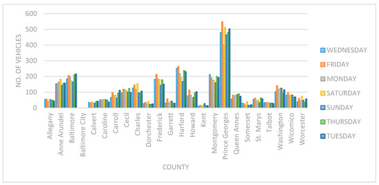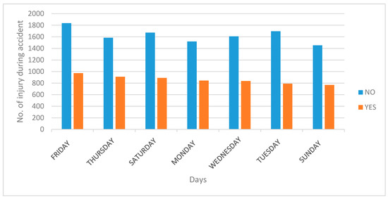 Various datasets of road traffic accidents in different places were analyzed; the results are discussed here. Figure 2 shows a graph of road traffic accident data, which were collected by the Maryland police department in the year 2012. The graph was prepared from an analysis of the accident dataset [39], which was downloaded from the US government’s data catalog. The graph shows that a higher number of road accidents, i.e., vehicle collisions, occurred during the weekends—from Friday to Sunday—in various counties of the US state of Maryland. These graph results will be applicable to most places in various countries, since road traffic flow is generally more on weekends. Hence, more attention should be paid to road traffic flow on weekends in order to prevent unnecessary road traffic accidents caused by factors such as vehicle collisions. Figure 3 shows the number of driver/passenger injuries caused by vehicle collisions or road traffic accidents. This graph was also prepared from an analysis of the accident dataset [39].