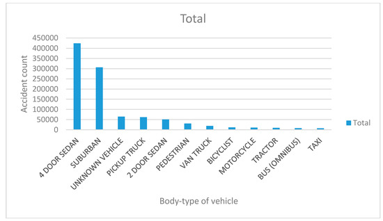 Figure 4 shows accident data for the three-year period of 2012–2014 in New York state [40]; the accident data are plotted according to the vehicle body type. From the graph, it is obvious that four-door sedans were involved in more accidents than were other vehicle body types.