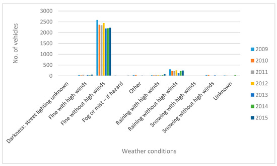 Figure 5 and Figure 6 show analysis results of accident data [41] for the city of Leeds for the period of 2009–2015. This accident dataset includes the number of people, the number of vehicles involved, the road surface conditions, the weather conditions, the severity of casualties, and so on. Figure 5 shows the number of accidents as a function of weather conditions; this figure reveals that more accidents occurred in fine weather without high winds and during rains without high winds. Furthermore, the number of accidents in these two scenarios was almost consistent in all years from 2009–2015. Figure 6 shows the number of accidents as a function of the road surface conditions; this figure reveals that more accidents occurred on dry road surfaces and wet/damp road surfaces. In this case, too, the number of accidents under these two road surface conditions was almost consistent in all years from 2009 to 2015. Road traffic accidents can be reduced to a moderate extent by taking appropriate precautionary steps based on the analysis reports of the weather-based and road-surface-based accident data. Such a moderate reduction in accidents, in turn, would lead to the development of effective transportation systems, which would further pave the way for sustainable transportation.