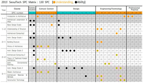 Courses that addressed sustainability issues have been identified and analyzed by reviewing the architectural program report of each program. According to the KAAB’s accreditation requirements, the architectural program reports need to refer to SPCs defined by the KAAB and be addressed to a sufficient degree in accredited university programs. The SPCs define specific topics that are divided into two categories: practical skills, with ability as a learning objective, and theoretical knowledge, with understanding as a learning objective. The specific skill or knowledge is directly associated with the comprehensive work of professional architects.