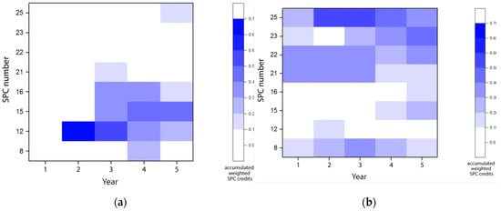 Conversely, five out of eight SPCs are primarily addressed in sustainability core courses. These include sustainable cities and architecture (SPC 8); sustainable means of environmental control (21); environmental control systems (22); building service systems (23); and building materials and recycling (25). Most accumulated sustainability core course credits are assigned to SPC 25, followed by SPCs 22, 21 and 23. The three dominant SPCs—25, 22 and 21—are mainly included in the curricula of the first three years, while SPC 23 is mainly addressed in the fourth and fifth years (Figure 7).