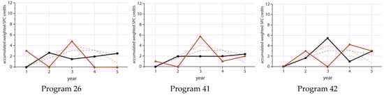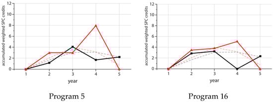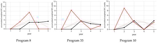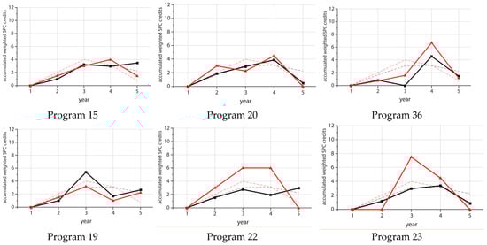 The distribution density of accumulated credits for sustainability SPCs in studios is narrow compared to those in sustainability core courses (Figure 6). Therefore, only programs with accumulated studio credits within a range of 8.38–11.30 are selected for a comparative sequential analysis of sustainability SPC credit distribution. As a result, 25 out of the 48 accredited programs have been selected for further analysis. Please refer to Supplementary Materials for figures with the distribution of accumulated sustainability SPC in studios and sustainability core courses during a five-year period of all 48 programs.