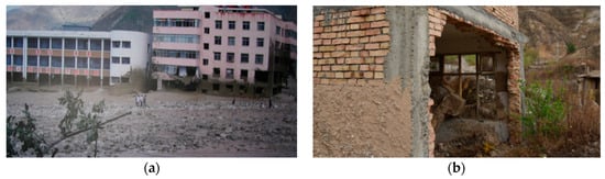 - Zhang, Y.; Wei, F.Q.; Cui, P. Destruction mode simulation of reinforced masonry structure under impact of debris flow. J. Disasters 2005, 14, 61–67. [Google Scholar]