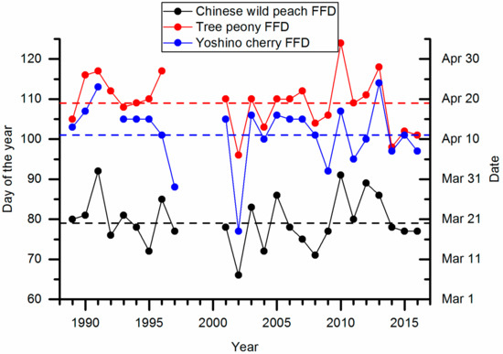 During 1989–2016, mean FFDs of Chinese wild peach, tree peony, and Yoshino cherry were 20 March, 19 April, and 11 April, respectively (Figure 1). The FFD of three species showed a high interannual variance. The maximum differences in FFD of three species among years reached 26, 28, and 37 days, respectively. No significant linear trends were found in time series of FFD. From 1989 to 1996, most FFD of three species was later than the long-term mean. During 2001–2009, FFD fluctuated around the long-term mean. After 2010, FFD was obviously later than the long-term mean except in the last three years (2014–2016).