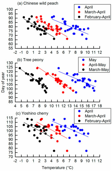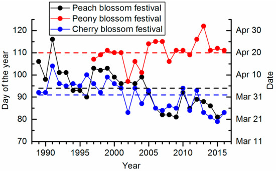 Many tourism destinations around the world are characterized by spring blossom festivals or events. For example, the national cherry blossom festival in Washington, DC, USA, attracted more than 1.5 million tourists in recent years [8]. More than 1.18 million people visited Beijing Botanical Garden, China to attend the peach blossom festival in 2017 [9]. Since these blossom festivals are culturally and economically important events, they should be timed around specific phenophases, such as flowering date of cherry or peach trees [10]. In temperate regions, these phenophases are very sensitive to small changes in temperature [11,12,13]. The advancement in flowering dates is estimated as 1 to 12 days for each 1 °C increase in spring temperature [14,15,16]. Recent studies demonstrated that the flowering date of main woody plants in temperate regions shifted towards earlier by a rate of 2.0 to 9.6 days decade−1 over the last few decades across Europe [17,18], East Asia [19,20], and North America [21,22].