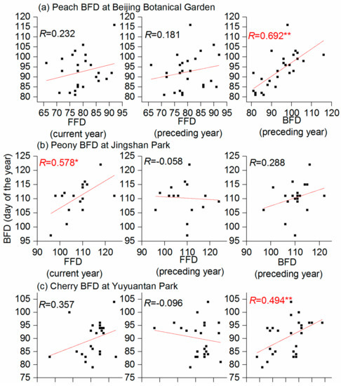 The peach and cherry BFD was significantly correlated with the BFD of the preceding year (p < 0.01, Figure 4). However, there is no significant relationship between BFD and FFD in the current or preceding year for Chinese wild peach and Yoshino cherry. Therefore, the administrators of the Beijing Botanical Garden and Yutuantan Park determined the peach and cherry BFDs based on their experience in the preceding year rather than the actual flowering date. Conversely, the peony BFD was significantly correlated with FFD of tree peony in the current year (R = 0.578, p < 0.05) rather than the FFD or BFD of the preceding year (Figure 4).