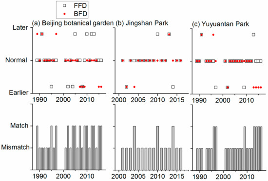 We compared matching degree between BFD and FFD for two observation periods of FFD (1989–1997 and 2001–2016). From 1989–1997, the mismatch between peach BFD and FFD of Chinese wild peach at Beijing Botanical Garden occurred in three years (1989, 1995, and 1997), which accounted for 33.3% of the total number of years (Figure 5a). During 2001–2016, the mismatch occurred in 10 years, which accounted for 62.5% of the total number of years. Therefore, the matching degree between BFD and FFD decreased in recent years at Beijing Botanical Garden. At Jingshan Park, the matching degree between peony BFD and FFD of tree peony was high (Figure 5b). The mismatch only occurred in three years (2004, 2010, and 2014) over the study period (2001–2016). At Yuyuantan Park, two years (22.2%) belonged to the mismatched condition before 1997, but it increased to five years from 2001 to 2016 (29.4%, Figure 5c). Overall, different locations displayed different matching degree between BFD and FFD. The proportion of mismatched years over the study period reached 46.4, 18.8, and 25.0% at Beijing Botanical Garden, Jingshan Park, and Yuyuantan Park, respectively.
