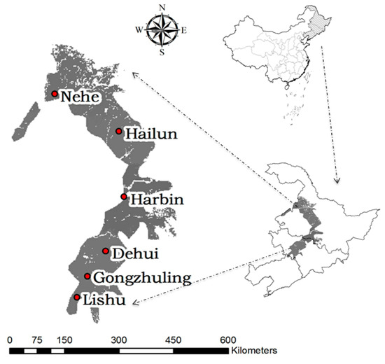 Since the 1980s, several phaeozem agricultural experimental demonstration sites and scientific observation stations were established by the Northeast Institute of Geography and Agroecology, Shenyang Institute of Applied Ecology, Department of Agriculture, China Academy of Agricultural Sciences and other research institutes. We selected typical long-term sites with continuous measured data including Hailun, Harbin, Gongzhuling, Dehui, Lishu and Nehe for our study area (Figure 1). The Lishu site in Jilin Province has a temperate semi-humid continental monsoon climate with a mean annual temperature of 6.8 °C and a mean annual precipitation of approximately 580 mm, concentrated in June, July, and August. The other five study sites (Hailun, Harbin, Gongzhuling, Dehui and Nehe) have a temperate continental monsoon climate with mean annual temperatures of approximately 1 °C in Helen and Nehe, and 3.5–5.6 °C in Harbin, Dehui and Gongzhuling. With the exceptionof mean annual precipitation of Nehe being below 500 mm, the other four sites were within 500–600 mm. All sites are warm and rainy in summer and cold with dry in winter. The specific site characteristics and treatment information are shown in Table 1.