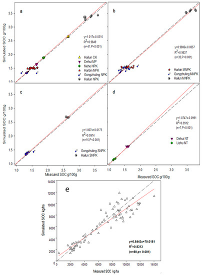 The simulation of SOC changes in this paper was divided into two sections. In the first section, the model performance is evaluated. The long-term measured datasets of the six sites (Hailun, Harbin, Gongzhuling, Dehui, Lishu and Nehe) were used for model calibration and validation. During this process, four treatments were simulated, and included the fertilizer application only (NPK), organic fertilizer incorporation (MNPK), straw return (SNPK), and straw return combining with no-tillage (NT) (Table 1). Through parameter adjustment of crop parameters (crop. 100), and management parameters (fert. 100, cult. 100, harv. 100, omad. 100), optimal parameters were obtained when the measured data fit with the simulated data; after, the adjusted parameters were used for model validation to test the applicability of model. Second, the calibrated and validated model was used to simulate future SOC changing trends of different management practices (NPK, MNPK, SNPK, NT) under the IPCC RCP 4.5 climate scenario at each site.