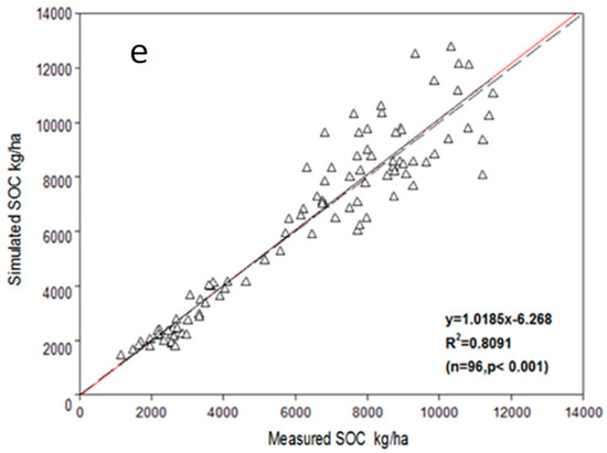 Validation: a comparison of simulated and measured SOC values of NPK Treatment (a); MNPK Treatment (b); SNPK Treatment (c); and NT Treatment (d). All treatments yielded values of simulated and measured compared in a scatter diagram (e).