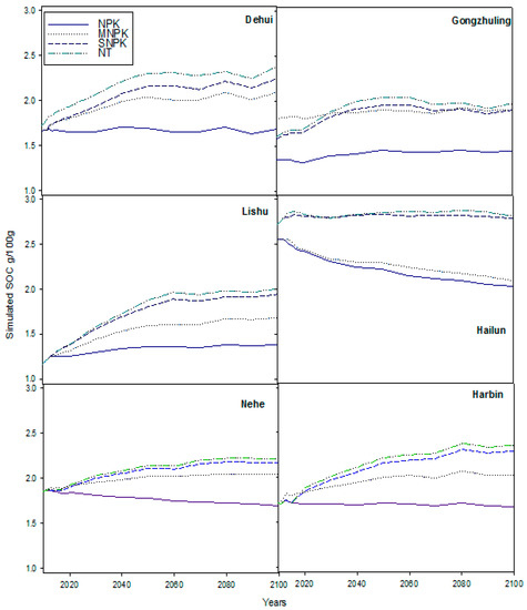 At the sites of Dehui, Gongzhuling, and Lishu, the SOC contents under four management scenarios all presented rising trends except under the NPK scenario where SOC remained stable, and the highest SOC contents reached 2.38 g/100 g, 1.97 g/100 g, and 2.01 g/100 g, respectively. Furthermore, every ten years, the average increasing rates were 0.064 g/100 g (duration of 86 years), 0.039 g/100 g (duration of 90 years), and 0.082 g/100 g (duration of 84 years), respectively. Of all the sites, SOC content at the Lishu site reached the highest under the NT scenario and increased by 52.5% when compared with the initial value. It was worth noting that at the Gongzhuling site (before the year 2040), the SOC content under the MNPK scenario was higher than under the SNPK scenario; yet after 2040, the SOC contents under the two scenarios remained the same. However, as the initial SOC content under the MNPK scenario was higher than those under other scenarios, it was predicted that the future SOC increasing rate under the MNPK scenario would be lower than those under the SNPK and NT scenarios.