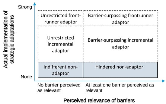 Methodologically, the study examines causes of non-adaptive behavior by comparing different classes of non-adaptors. The classes were distinguished by crossing two indicators, which could be calculated based on survey data: first, the actual implementation of strategic adaptations and second, the perceived relevance of barriers (see Section 5.2.1 and Appendix B regarding the operationalization of these aspects in the survey). Figure 2 depicts the conceptualized classes of (non-)adaptors.
