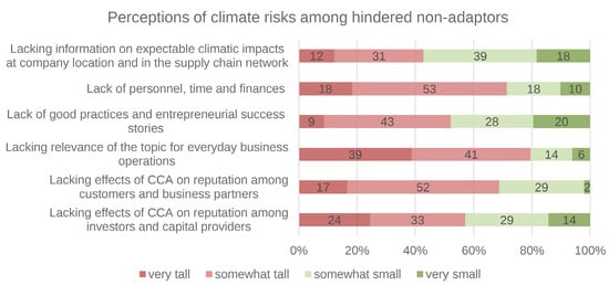 Figure 4 shows that ‘lacking relevance of the topic for everyday business operations’, a ‘lack of personnel, time and finances’, and ‘lacking effects of climate change adaptation on reputation among customers and business partners’ were perceived as most relevant barriers. These barriers were each considered as either ‘somewhat tall’ or ‘very tall’ by more than two thirds of respondents belonging to this group.