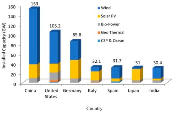 According to the Navigant research report of fourth quarter 2015, the microgrid market opportunity is expected to grow over 3.5 times between 2015 and 2020. More than 1437 microgrid projects that represent nearly 13,400 megawatts of capacity are proposed, planned, under construction or operating worldwide [7]. By the end of 2014, the countries with the most total installed renewable (not including hydropower) electricity capacity were China, the USA, and Germany; they were followed by Italy, Spain, Japan, and India, which all ended the year with approximately similar capacity levels, as depicted in Figure 1 [8].