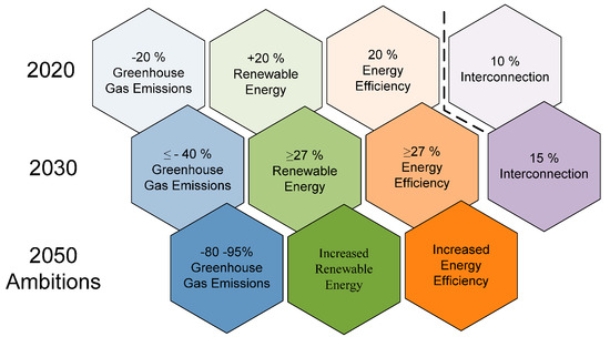 The European Union electric power sector is structured on a centralized generation and consumption system, which implies economic, environmental and technical disadvantages. Within the context of growing electricity demand and environmental problems, the EU power sector is currently facing changes and evolution in response to three energy-related challenges: (1) GHG emission reduction “environmental sustainability”; (2) security of supply; and (3) competitiveness [23]. The solutions to European electric system problems are promotion and maximum utilization of renewable energy sources (RES), distributed generation (DG) and deployment of microgrids, by improving energy efficiency, decreasing GHG emission complying with European Commission energy 2020 targets. These are discussed in [24,25,26,27]. Most EU member states are endeavoring to achieve the 2020 target, as shown in Figure 3. In October 2014 the EU agreed on vision 2030, involving to further increase the penetration of renewable energy technologies and improve overall energy efficiency up to 27%, being 45% of total renewable energy electricity production in the EU power sector with a 40% reduction of greenhouse gases, along with an ambition 2050 target to reduce greenhouse gases by up to 95% as depicted in Figure 4 [28,29].