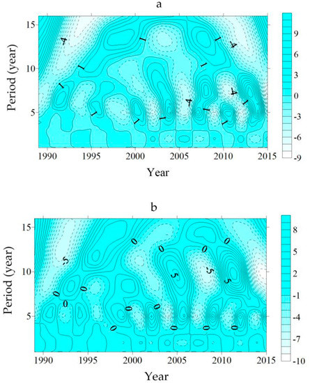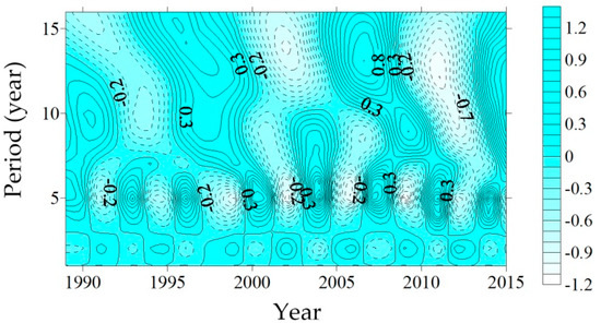 The mean temperature in December during 1989–2015 was −0.99 °C with a standard deviation of 1.13 °C; the lowest temperature in December was −4.2 °C in 2012, while the highest one was 0.9 °C in 1996. The temperatures in December showed a periodical change pattern similar to that of the ice phenology, with the contour plot of wavelet coefficients (Figure 5) showing a dense distribution on a timescale of 1–2a, 3–7a, and 8–15a. In particular, the periodical change on the timescale of 3–7 a was the most obvious, with strong amplitudes throughout the cycles; the middle timescale was approximately 5a, and with three years to form a cycle, the temperature experienced seven cycles of low temperatures and high temperatures.
