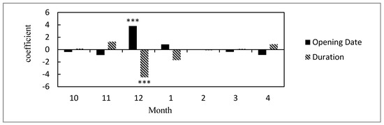 The unit root test of the residuals of the regression between the ice phenology and temperature (Table 2) indicated that the residuals formed a stable series and, therefore, there existed a cointegration relationship between the field opening dates and the winter half-year temperatures, and one between the field operation duration times and the winter half-year temperatures as well. In the regression analysis, the R2 values for the field opening dates and operation duration times in relation to the winter half-year temperatures were 0.403 and 0.501, respectively, which indicates that the winter half-year temperatures explained a relatively high percentage of the opening date variance and operation duration time variance. The temperature in December showed a significant effect on the dependent variables (Figure 4). According to the statistical model, an increase of the temperature by 1 °C in December led to a delay of 3.80 days for the opening dates and a reduction of 4.49 days for the operation duration times.