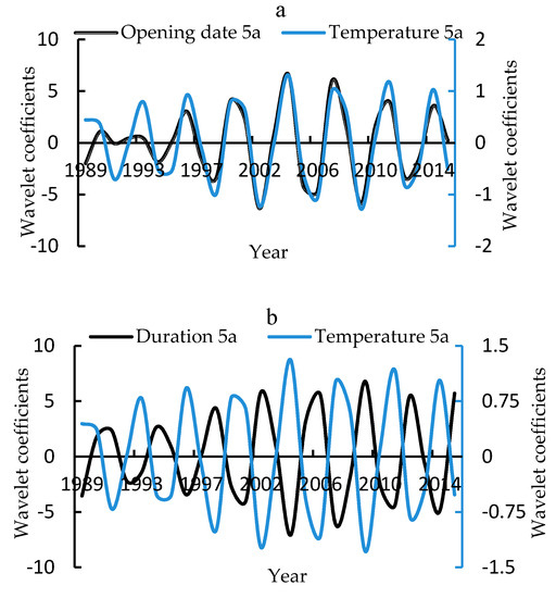 The wavelet coefficient curves in the 5a period scales for the December average air temperatures; (a) opening dates and (b) duration.