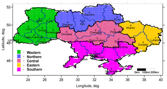 Five bioclimatic regions of Ukraine: Western, Northern, Central, Eastern and Southern. Boundaries of administrative units (oblasts) are shown within the regions.